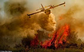 da seguinte forma: uma grande mangueira hidráulica ou um avião lança água sobre